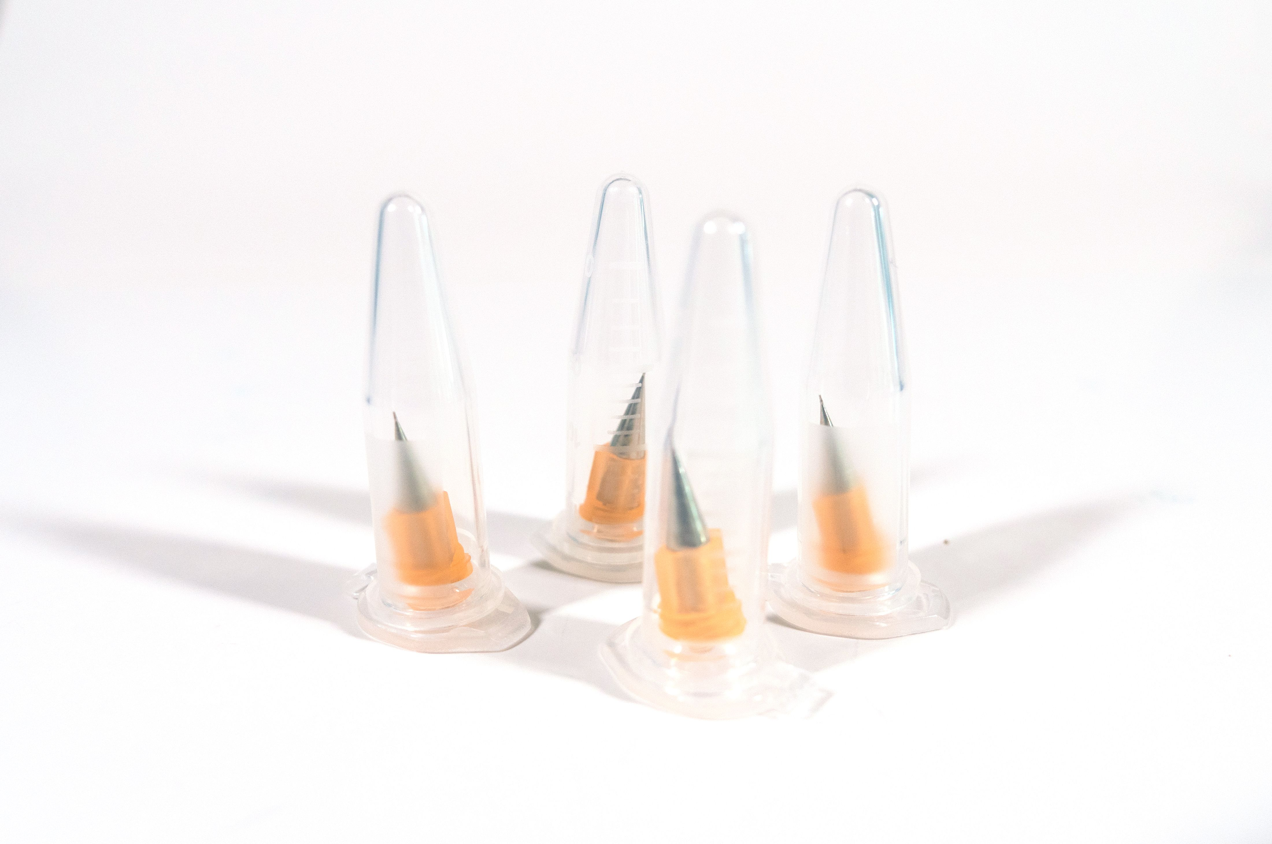 Each pack contains four metal nozzles — 100 µm (4 mil) inner diameter.
