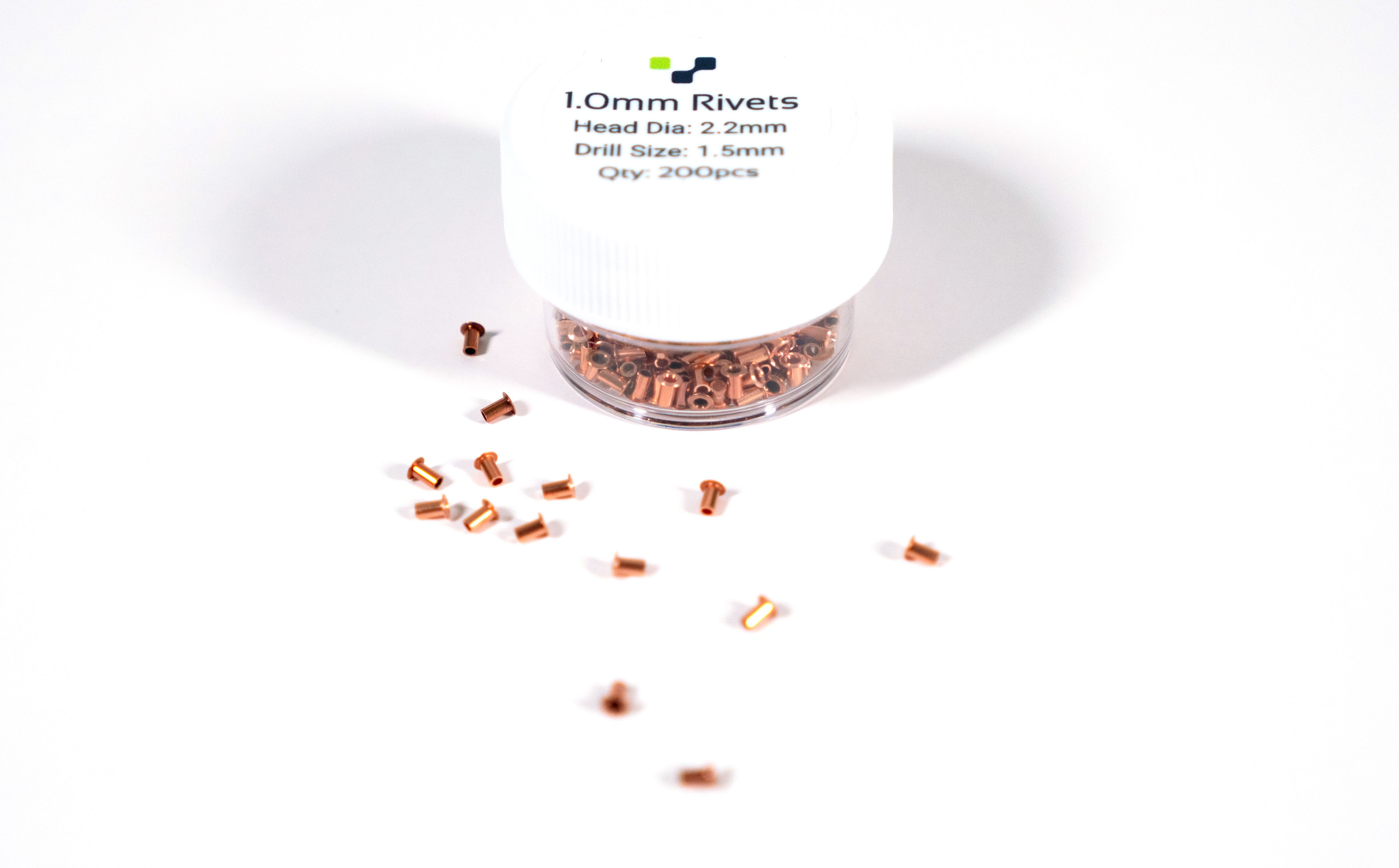 Rivets are small copper tubes used to create vias. These vias form a mechanical connection between the top and bottom layer of a PCB. To install, purchase the 1.00mm rivet tool that corresponds with the size of these copper rivets.