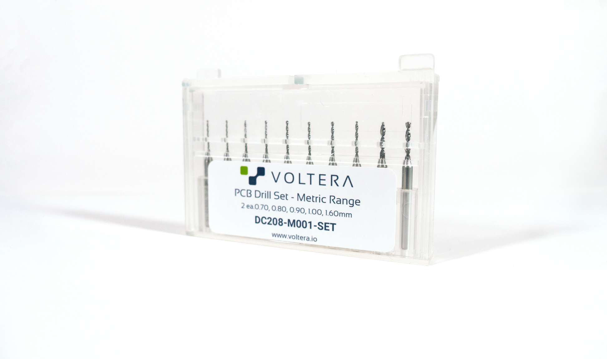 A 10-piece set of high-precision PCB drill bits, containing the most common drill bit sizes. Insert in the V-One drill using a 2.5mm hex key (not included).